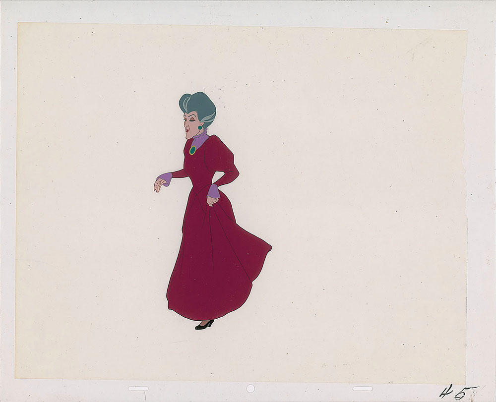 (Walt Disney Studios, 1950) Original production cel featuring the Wicked Stepmother from Cinderella, portraying Lady Tremaine in an exquisite full-length walking pose. Image measures 3.75 x 7.5, with overall dimensions of 15.5 x 12.5. Cel is marked "45" in the lower right corner. In fine condition. Learn more about our Animation Expert, Harry Kleiman.
