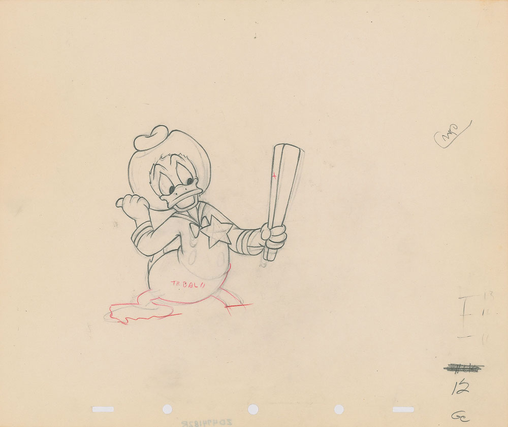 (Walt Disney Studios, 1941) Original production drawing featuring Donald Duck from Truant Officer Donald, showing him in his officer's uniform with a big star-shaped badge. Accomplished in graphite and colored pencil on untrimmed 12 x 10 animation paper, marked "12" in the lower right. Image measures 4.75 x 4.75. In fine condition. Learn more about our Animation Expert, Harry Kleiman.