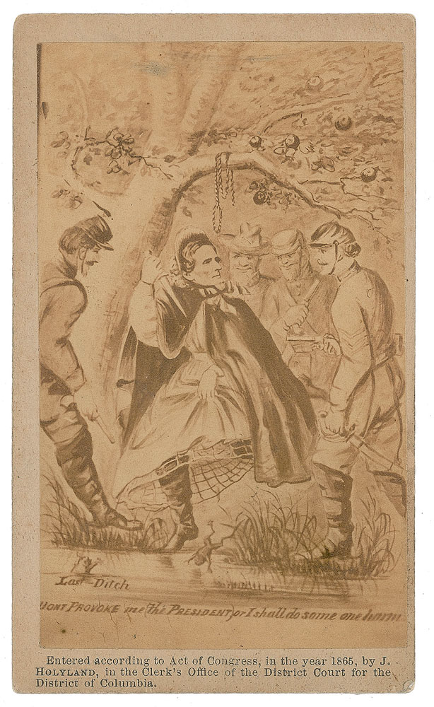 Original 2.25 x 4 carte-de-visite photo of an artist's depiction of Jefferson Davis on the run after the Civil War while wearing a woman's dress, marked on the mount: "Entered according to Act of Congress, in the year 1865, by J. Holyland, in the Clerk's Office of the District Court for the District of Columbia." In fine condition.