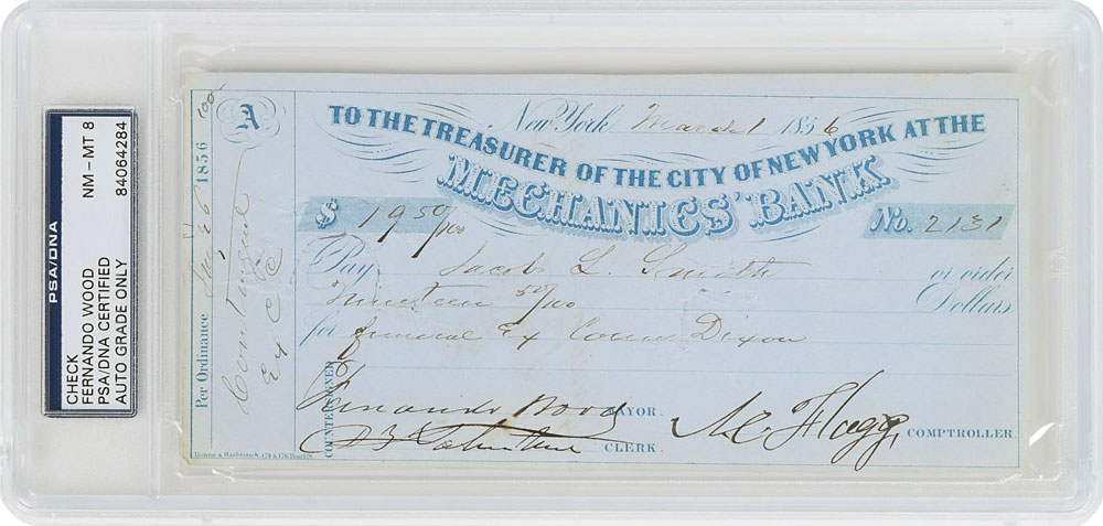 Statesman (1812-1881) who is most famous for being one of the most colorful mayors in the history of New York City. At the outbreak of the Civil War, he recommended that New York secede and become a 'free city.' Partly-printed DS, one page, 7.25 x 3.5, March 1, 1856. Ornate pay order to the treasurer of New York City, paying Jacob L. Smith the sum of $19.50 for funeral expenses. Signed at the conclusion by Fernando Wood as mayor, and also by a clerk and comptroller. Encapsulated in a plastic PSA/DNA authentication and grading holder, evaluating the autograph as "NM-MT 8." In fine condition.