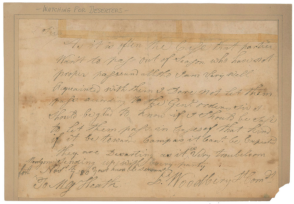 Uncommon ALS signed “L. Woodbery, Lt. Com'd,” one page, 8.25 x 5.5, November 7, 1780. Written from Fort Montgomery, a letter to Major General William heath, in full: "As it is often The Case that parties Want to pass out of season who have not proper passes alltho I am Very Well Acquainted with them I have not let them pass according to the Gen'l orders Sir I should be glad to know if I should be safe to let them pass in cases of that kind if it be towards Camp as it Cant be Expected They are Deserting as it is Very troubelsom sending up with every party." Letter is affixed to a slightly larger sheet. In very good condition, with foxing and staining, and old repairs to split folds.