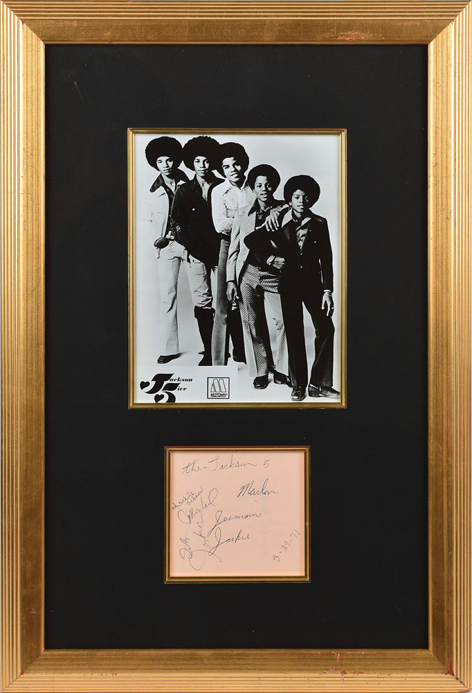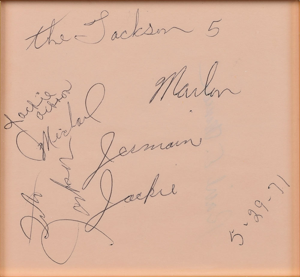 Spectacular early vintage ballpoint signatures of Michael, Jackie, Marlon, Jermaine, and Tito Jackson on a pink 4.5 x 4.25 album page, annotated with a date of May 29, 1971. Handsomely matted and framed with a publicity photo of the group to an overall size of 16.5 x 24. In fine condition, with light show-through from an unidentified signature on the reverse.