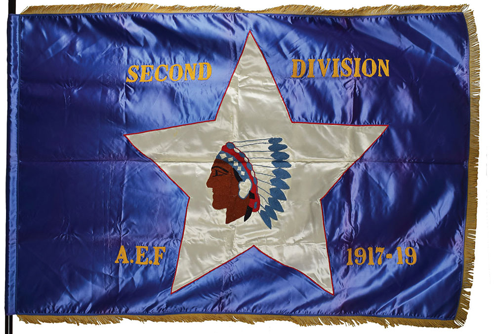 Blue silk parade flag with gold fringe honoring the United States 2nd Infantry Division's participation in World War I, measuring 68 x 45, having a white star with intricately embroidered Indian head device at the center of both sides. One side reads, "Second Division, A.E.F., 1917-1919," in yellow, and the other side lists the names of the unit's battles in red: "Chateau Thierry," "Meuse Argonne," "Mont Blanc," "Saint Mihiel," and "Soissons." In fine condition.