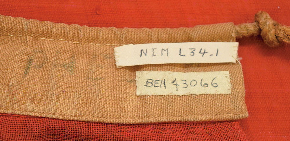 Uncommon Indian Wars period (circa 1877-1890) 38-star American flag, measuring approximately 100″ x 60″, made from a wool bunting material, the blue canton featuring white cotton stars sewn on both sides. The 38 stars are arranged in a uniform 7/8/8/8/7 pattern. There are no metal grommets on the hoist, but rather an old braided rope cord sewn in with loops on either end. At the bottom of the hoist are two small modern museum identification tags; the consignor notes that this flag was displayed at the Infantry Museum at Fort Benning, Georgia, for over thirty years. In very good condition, with some staining to the hoist, and a few holes and areas of fraying to the flag.