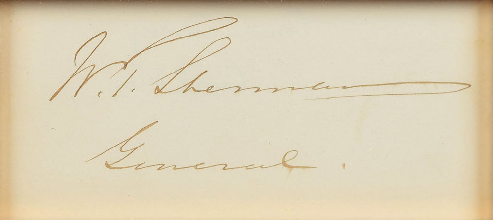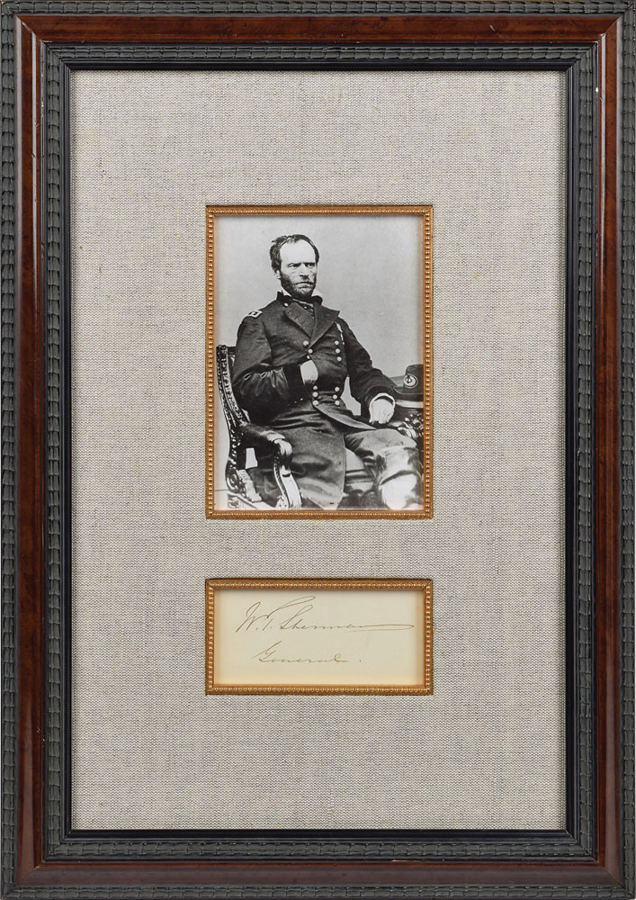 Ink signature, "W. T. Sherman, General,” on an off-white 4.5 x 2 slip. Attractively cloth-matted and framed with a portrait to an overall size of 13.5 x 19.5. In fine condition.