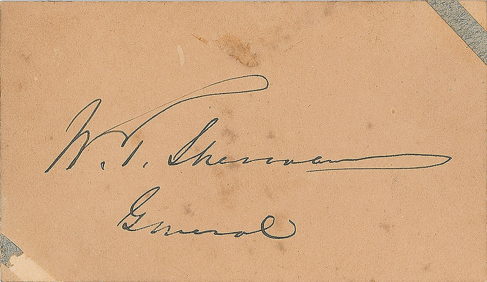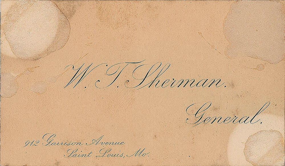 General William T. Sherman's personal calling card imprinted with his name, rank, and address in St. Louis, 3.25 x 2, signed on the reverse in ink, "W. T. Sherman, General." In very good condition, with irregular toning, staining, and remnants of two corner mounts.