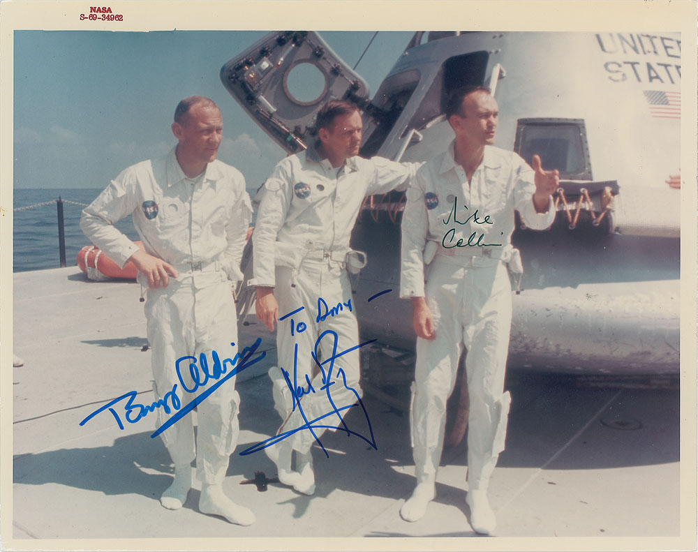 Superlative official color glossy 10 x 8 red-numbered NASA photo of the Apollo 11 crew during water egress training in the Gulf of Mexico, beautifully signed and inscribed in blue felt tip, "To Amy—Neil Armstrong” and "Buzz Aldrin," and in black felt tip, "Mike Collins." In fine condition, with one trivial surface crease. An uncommon image boasting a choice trio of signatures from the first lunar landers.