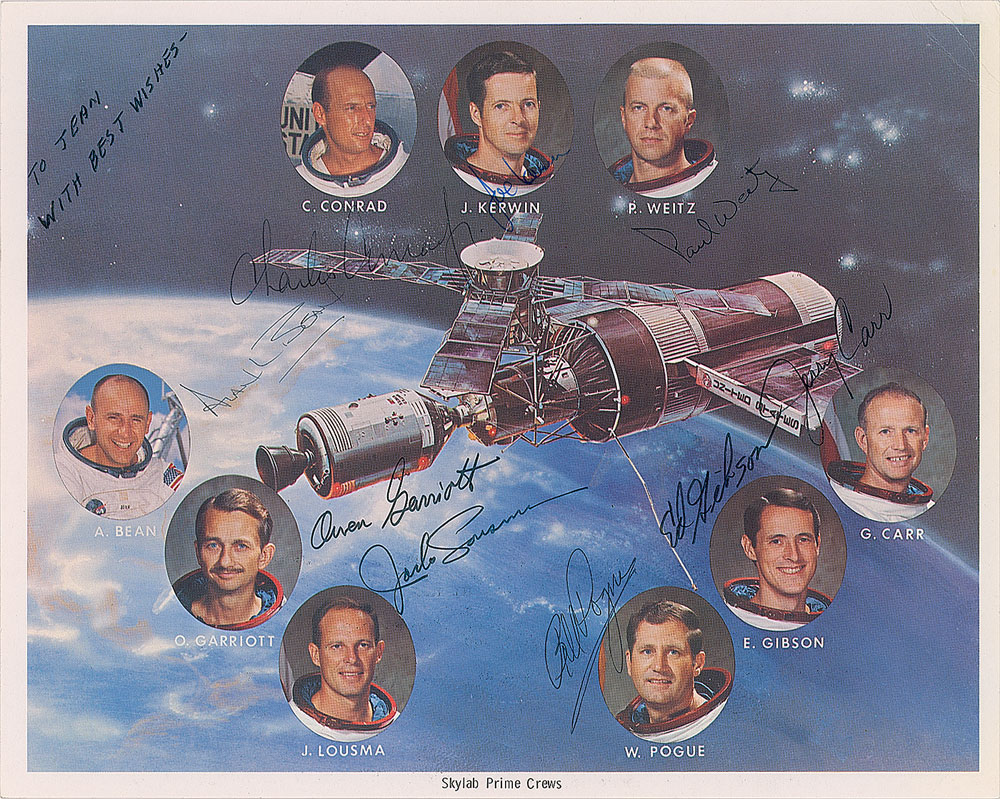 Official color 10 x 8 NASA lithograph of the Skylab space station with 'floating head' images of the nine prime crew members, signed in felt tip and ballpoint by all nine: Charles Conrad, Joe Kerwin, Paul Weitz, Alan Bean, Owen Garriott, Jack Lousma, Bill Pogue, Ed Gibson, and Jerry Carr. Inscribed in an unknown hand, "To Jean, with best wishes." In very good to fine condition, with light creasing to two corners.