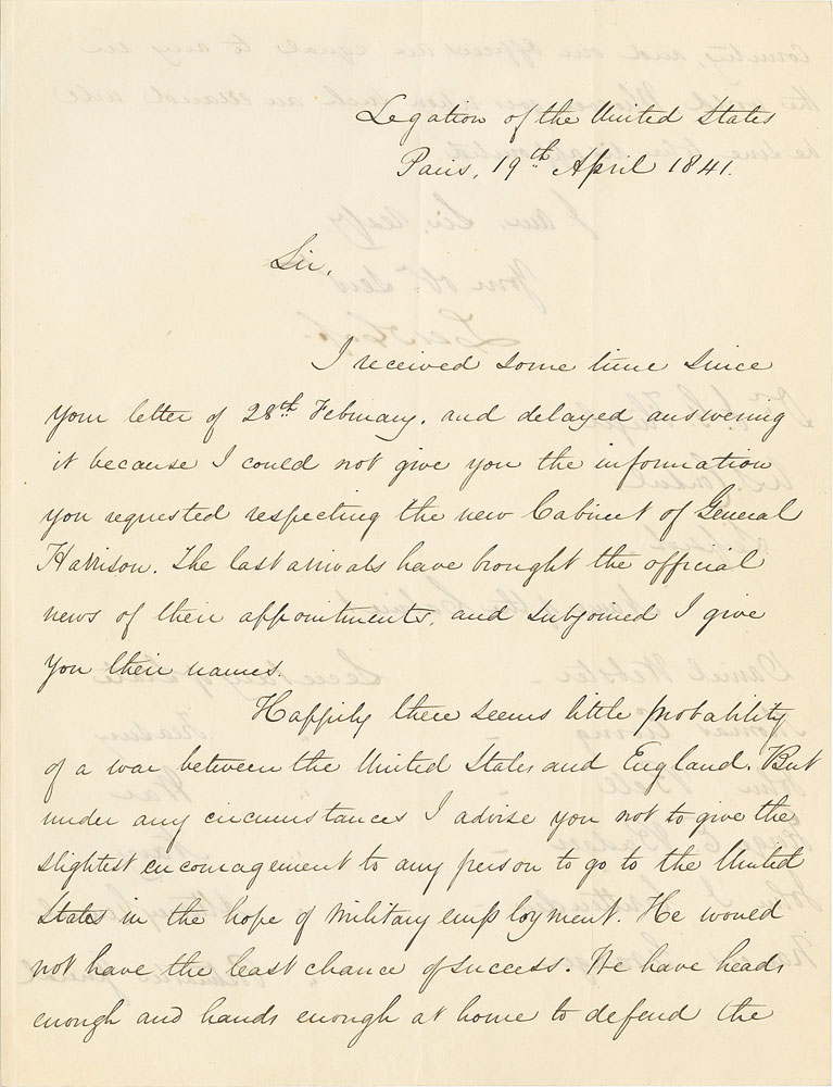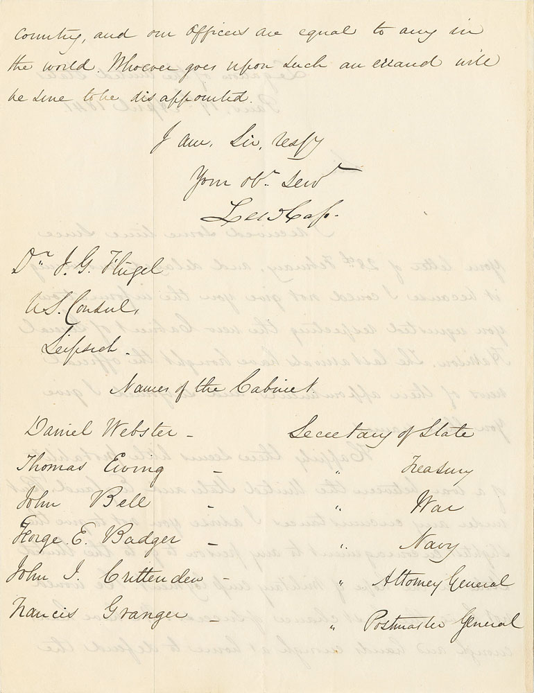 American statesman (1782-1866) who served variously as governor of Michigan, senator, ambassador to France, secretary of war, and secretary of state. LS signed “Lew. Cass,” one page both sides, 7.25 x 9.75, April 19, 1841. Letter to German lexicographer and American consul Dr. Johann Gottfried Flügel, in full: "I received some time since your letter of 28th February, and delayed answering it because I could not give you the information you requested respecting the new Cabinet of General Harrison. The last arrivals have brought the official news of their appointments and subjoined I give you their names. Happily there seems little probability of a war between the United States and England. But under any circumstances I advise you not to give the slightest encouragement to any person to go to the United States in the hope of military employment. He would not have the least chance of success. We have head enough and hands enough at home to defend the country, and our officers are equal to any in the world. Whoever goes upon such an errand will be sure to be disappointed." The names of Harrison's updated cabinet are listed below. In fine condition.