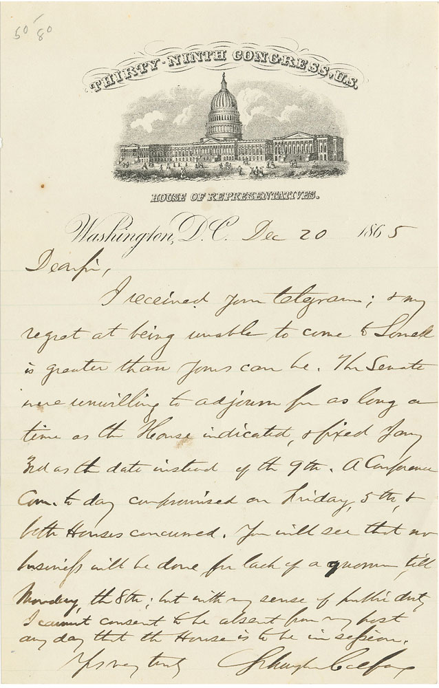 The 17th Vice President of the United States (1823-1885) who also served as a United States Representative from Indiana and as the 25th Speaker of the House of Representatives. ALS, one page, 5 x 7.75, engraved Thirty-Ninth Congress letterhead, December 20, 1865. In part: "I received your telegram; & my regret at being unable to come to Lowell is greater than yours can be. The Senate were unwilling to adjourn for as long a time as the House indicated, & fixed Jany 3rd as the date instead of the 9th…You will see that no business will be done…till Monday the 8th; but with my sense of public duty I cannot consent to be absent from my post any day that the House is to be in session." In fine condition.