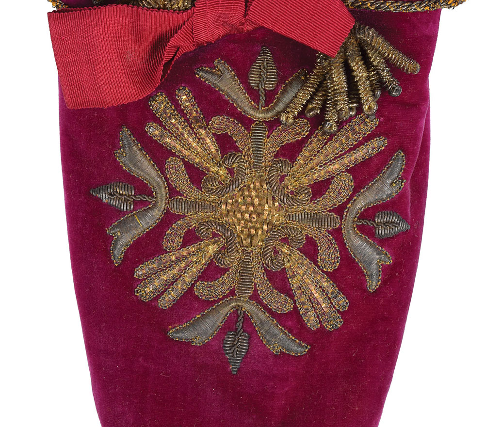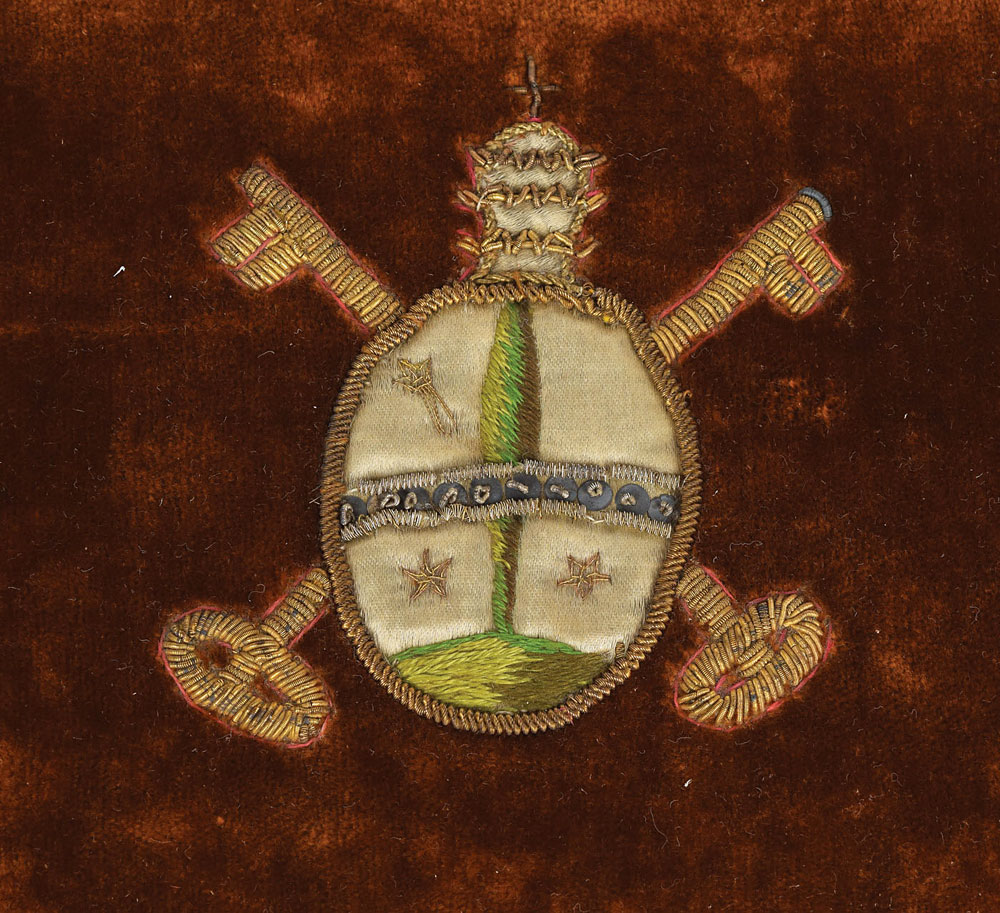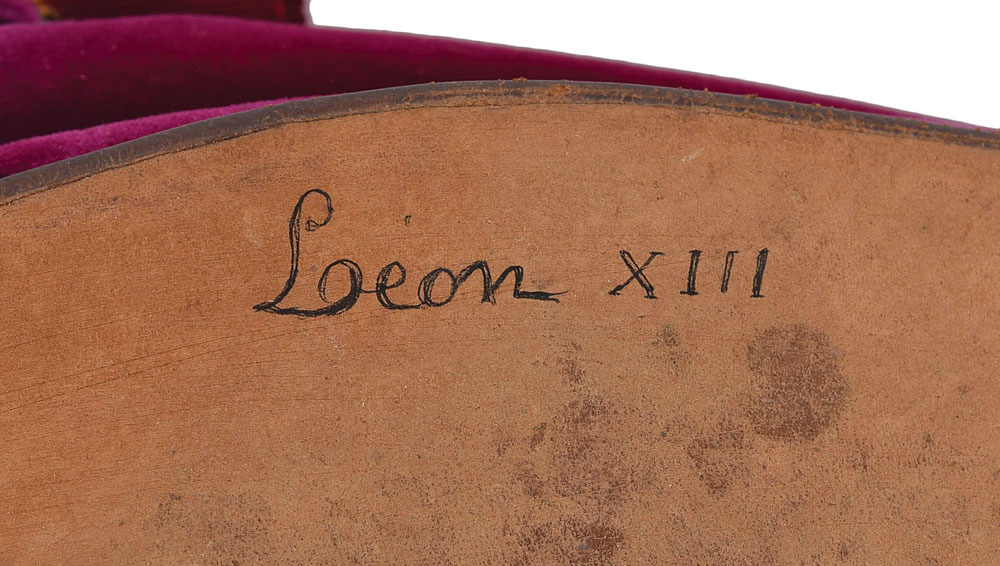 Lavish handmade velvet papal slipper attributed to Pope Leo XIII, measuring 10.75″ long, featuring braided yellow-gold trim and a matching ornate embroidered design on the top of the foot, with a red ribbon and gold tassel shoelace. The soft leather sole is annotated in ink, “Leon XIII.” The beautiful shoe is housed in an elegant brown velvet decorative box, with the lid featuring an ornate embroidered coat of arms of Pope Leo XIII. The care with which the slipper was stored is an indication of its value to the original owner. In fine condition, with expected wear. A magnificent papal piece.