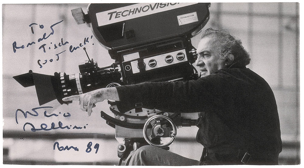 Semi-glossy 7 x 3.75 magazine photo of Fellini directing from behind the camera, signed and inscribed in black felt tip, "To Ronald Tisch, Good luck! Federico Fellini, Roma 89." In fine condition, with creasing to the right edge.