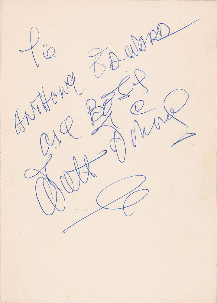 Desirable ballpoint signature and inscription, "To Anthony Edward, My best, Walt Disney,” on the inside of colorful greeting card, which measures 12.75 x 9 when opened. In fine condition.