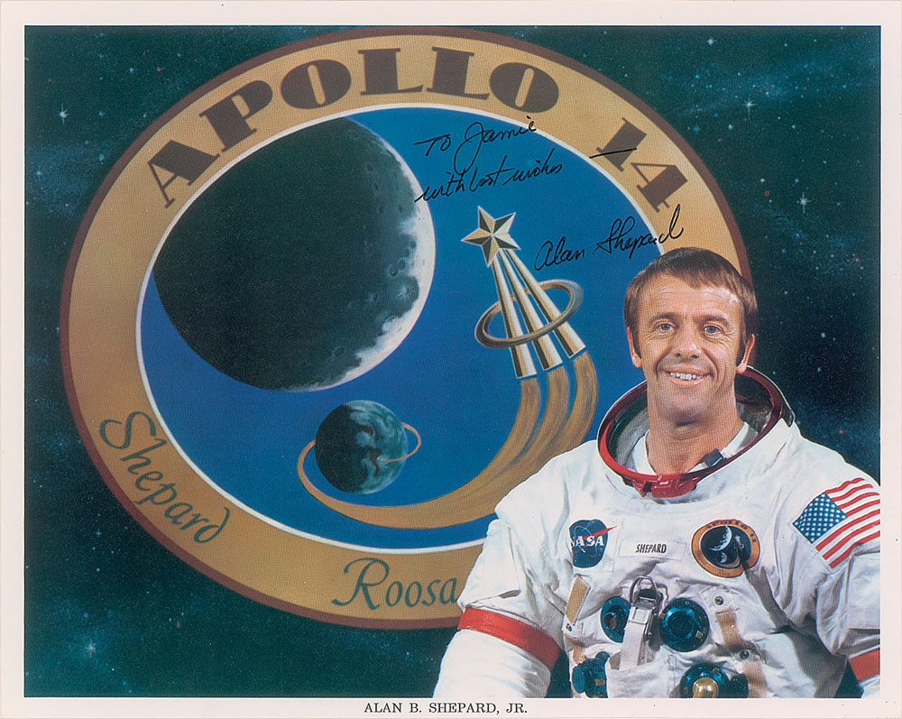 Official color 10 x 8 NASA lithograph of Shepard posing in his white space suit against the Apollo 14 mission emblem, signed and inscribed in thin black felt tip, "To Jamie, with best wishes—Alan Shepard.” In fine condition.
