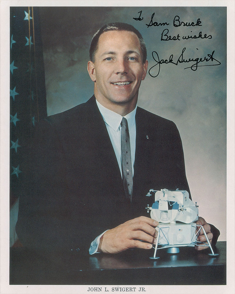 Uncommon official color 8 x 10 NASA lithograph of the Apollo 13 CMP posing with a model of an Apollo moon lander, signed and inscribed in black felt tip, "To Sam Bruck, Best wishes, Jack Swigert.” In fine condition.