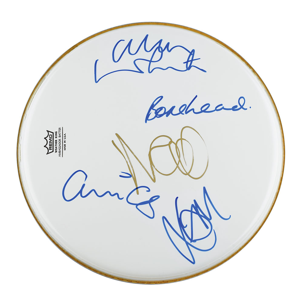 Desirable off-white Remo Weatherking Ambassador Batter drum head, 14.5″ in diameter, signed in blue felt tip by Liam Gallagher, Alan White, Paul 'Bonehead' Arthurs, and Paul McGuigan, and in gold ink by Noel Gallagher. In fine condition.