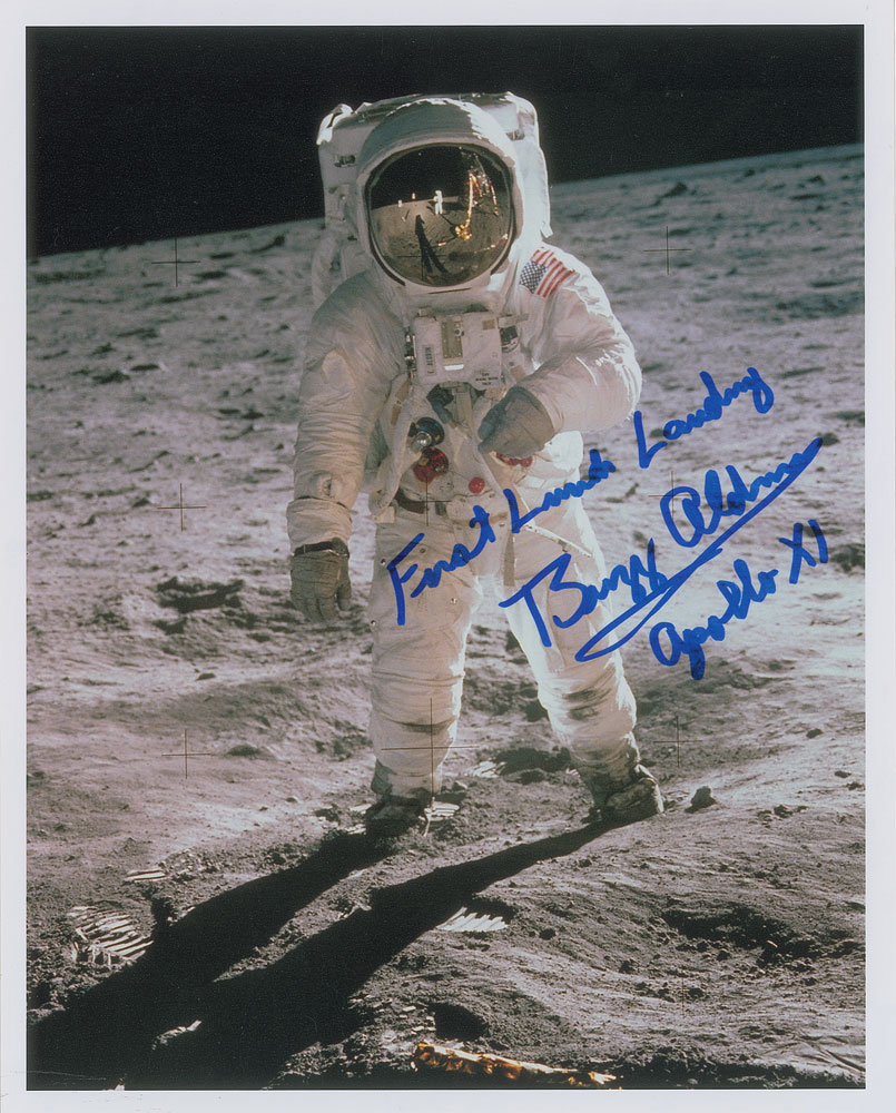 Iconic color satin-finish 8 x 10 photo of Buzz Aldrin walking on the lunar surface, his visor showing a small reflection of the photographer, Neil Armstrong, signed in blue felt tip, "First Lunar Landing, Buzz Aldrin, Apollo XI." In very fine condition.