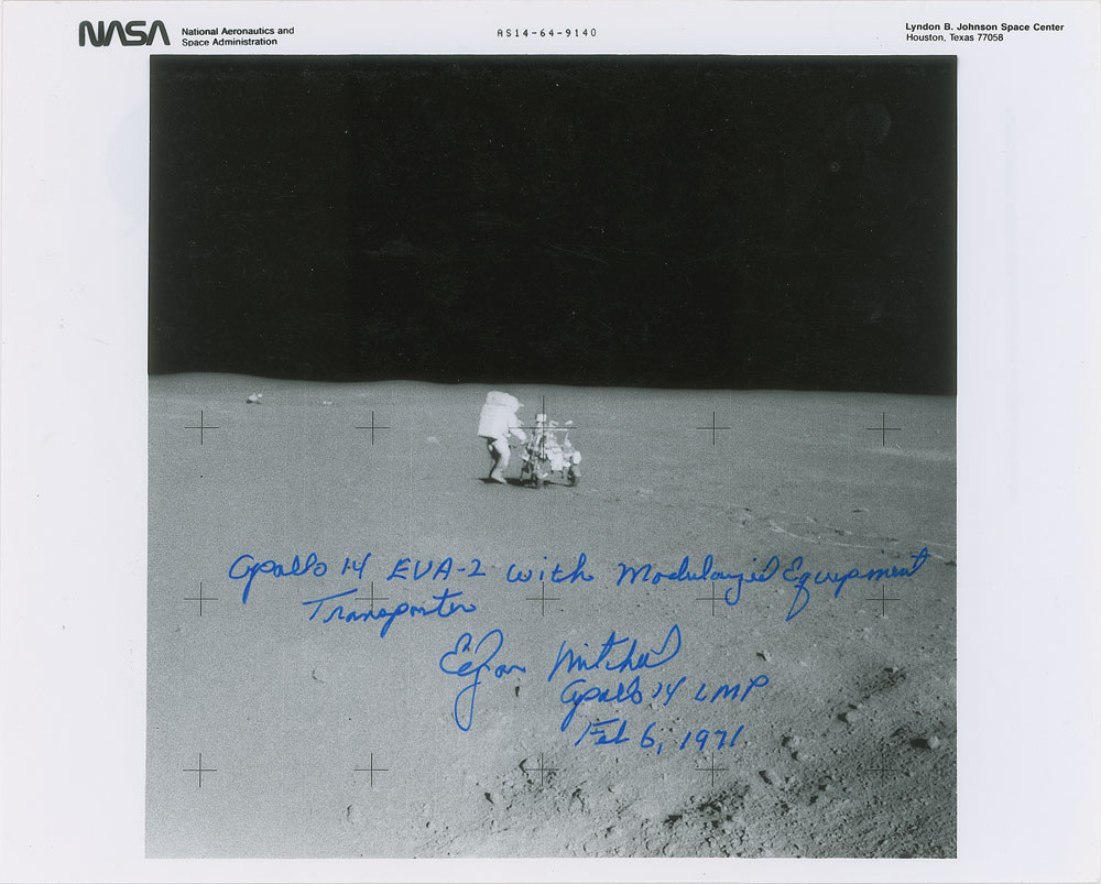 Uncommon glossy 10 x 8 reproduction of a black-numbered NASA photo of Mitchell moving equipment during his second EVA, signed in blue felt tip, "Apollo 14 EVA-2 with Mechanized Equipment Transporter, Edgar Mitchell, Apollo 14 LMP, Feb 6, 1971." Reverse bears reproduced black NASA caption text. In fine condition, with a couple of very faint horizontal bends.