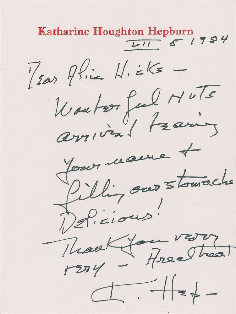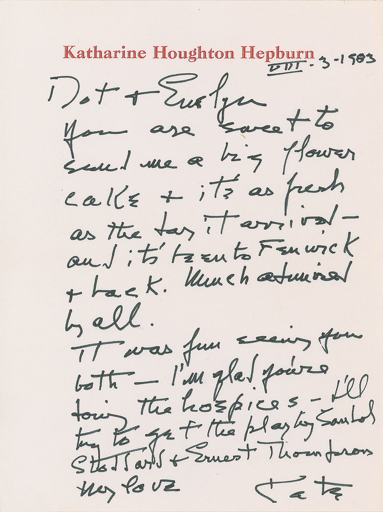 Two ALSs, signed "Kate" and "K. Hep," both one page, 6 x 8, personal letterhead. The earlier letter, dated August 3, 1983, addressed to Dot and Evelyn, in part: "It was fun seeing you both—I'm glad you're doing the hospices—I'll try to get the play by Sandol Stoddard & Ernest Thompson." The second, July 5, 1984, to Alice Hicks, in part: "Wonderful nuts arrived bearing your name & filling our stomachs. Delicious!" In overall fine condition.