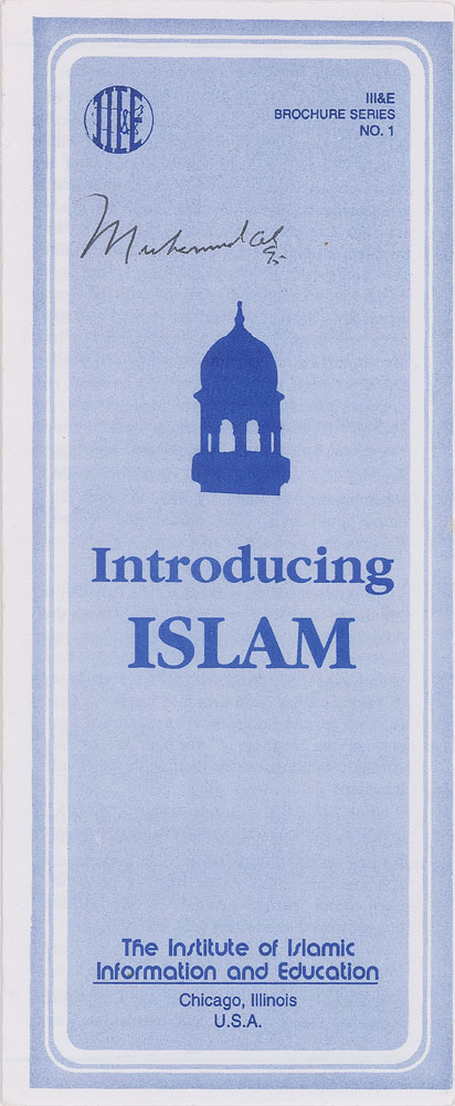 Folding religious brochure entitled "Introducing Islam" published by The Institute of Islamic Information and Education in Chicago, 3.5 x 8.5, signed on the front in black ballpoint, "Muhammad Ali, 95." In fine condition.