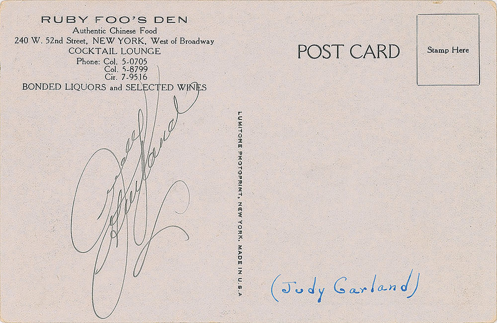 Vintage pencil signature, "Judy Garland,” on the reverse of a 5.25 x 3.5 postcard for New York Chinese restaurant Ruby Foo's Den. In fine condition.