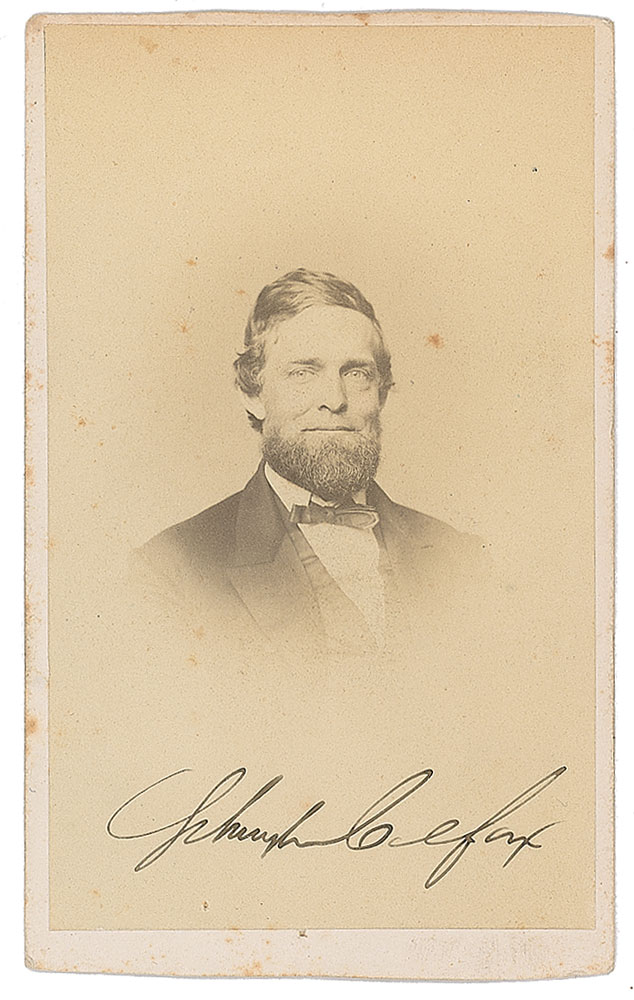Congressman, speaker of the House, and vice president under U. S. Grant (1823-1885). Superb 2.5 x 4 photo of Colfax in a suit and bow tie, signed in ink, "Schuyler Colfax." In fine condition, with a bit of light foxing.
