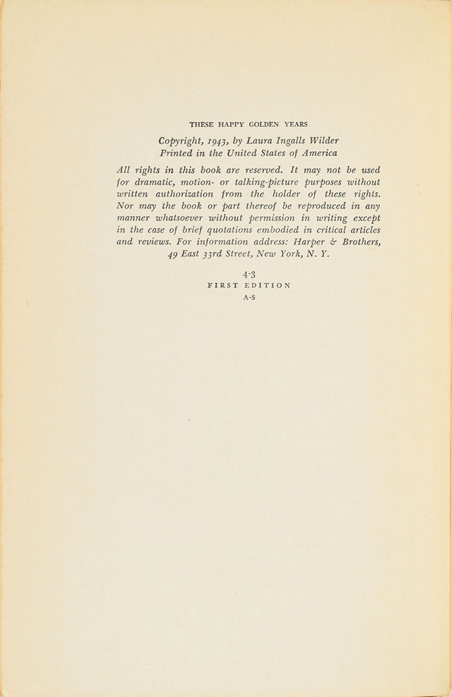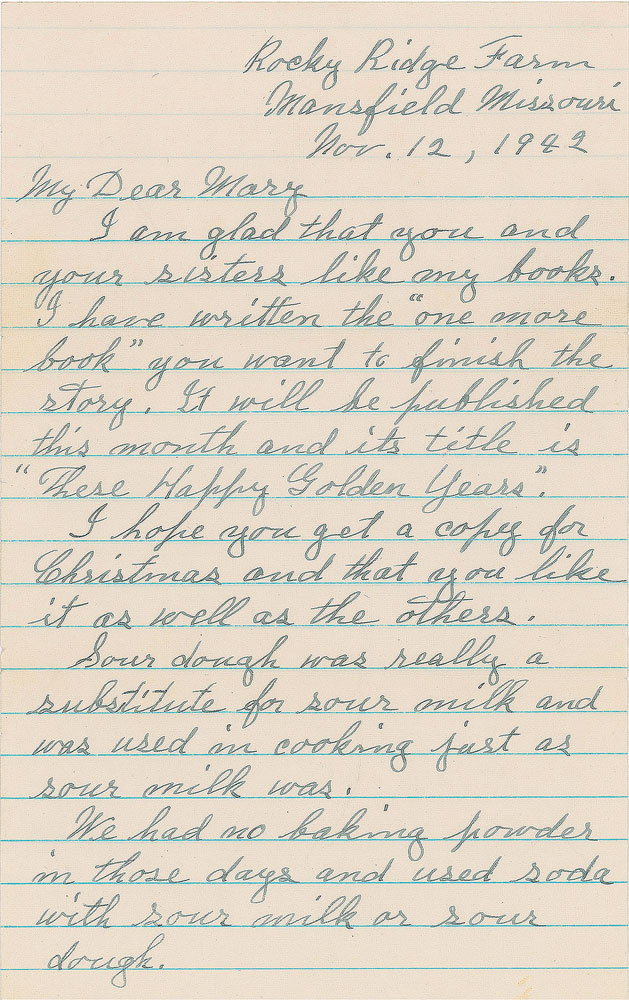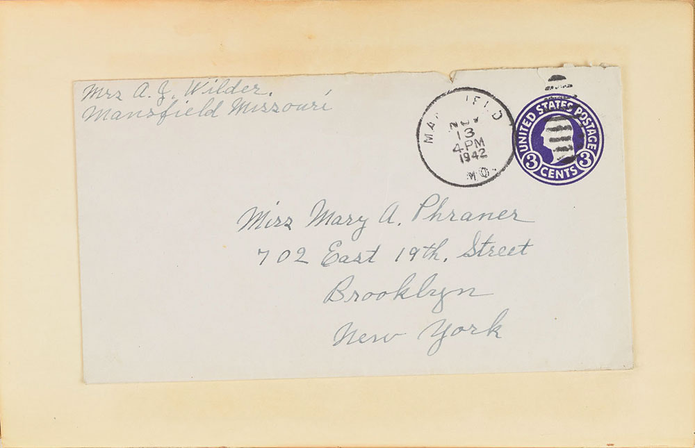 ALS, two pages, 5 x 8, November 12, 1942. Letter to Mary A. Phraner, in part: "I am glad that you and your sisters like my books. I have written the 'one more book' you want to finish the story. It will be published this month and its title is 'These Happy Golden Years.' I hope you get a copy for Christmas and that you like it as well as the others. Sour dough was really a substitute for sour milk and was used in cooking just as sour milk was. We had no baking powder in those days and used soda with sour milk or sour dough. To start it, mother mixed warm water and flour a pinch of salt and a little sugar making it about as thick as gravey. This was kept in a warm place until it soured. It was then used as sour milk to make the biscuit but a little of it was left to help start the next batch souring…We used it only when we had no milk, which of course is better." Includes the original mailing envelope addressed in Wilder's hand, incorporating her name, "Mrs. A. J. Wilder," into the return address; the envelope is affixed inside a sought-after first edition of These Happy Golden Years, the book she references in the letter. The letter is in fine condition; the book is VG-/None, with heavy wear to the spine and splits to spine cloth. These Happy Golden Years is based on Wilder's adolescence near De Smet, South Dakota, and was the final 'Little House' book published in Wilder's lifetime.