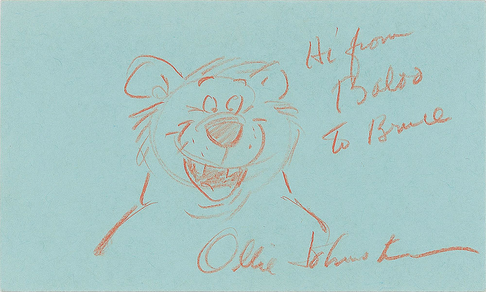 Original sketch of Baloo, the sloth bear, from the 1967 animated Disney film The Jungle Book, accomplished in orange artist pencil on a light blue 5 x 3 card by Johnston, who signs below and adds an inscription above, "Hi from Baloo to Bruce." In fine condition.