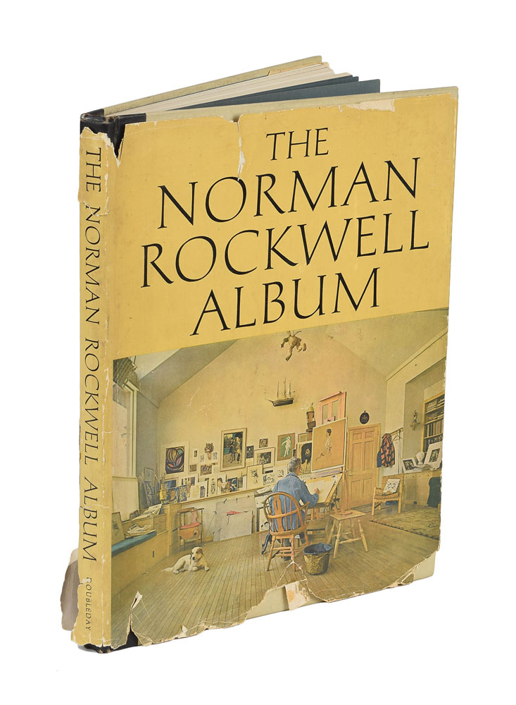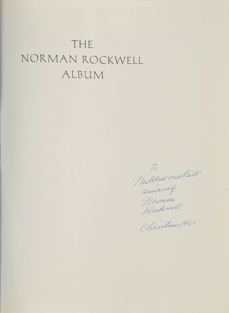 Signed book: The Norman Rockwell Album. First edition. NY: Doubleday & Company, 1961. Hardcover with dust jacket, 11 x 14, 191 pages. Signed and inscribed on the half-title page in blue ballpoint, "To Mildred and Bill, sincerely, Norman Rockwell, Christmas 1961." The book is in fine condition; the dust jacket is in rough condition, with tears and paper loss.