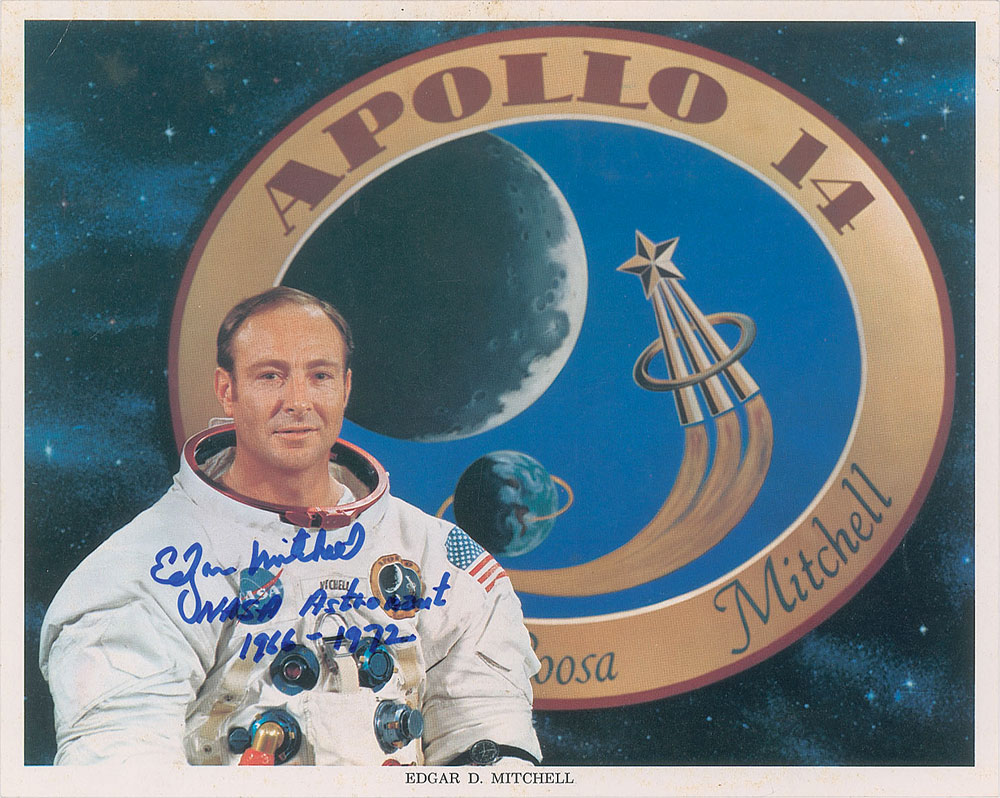 Official color 10 x 8 NASA lithograph of Mitchell in his white space suit, with a large Apollo 14 insignia in the background, signed in blue felt tip, "Edgar Mitchell, NASA Astronaut, 1966-1972." In very good to fine condition, with scattered light scuffing, and a crease to the upper left corner.