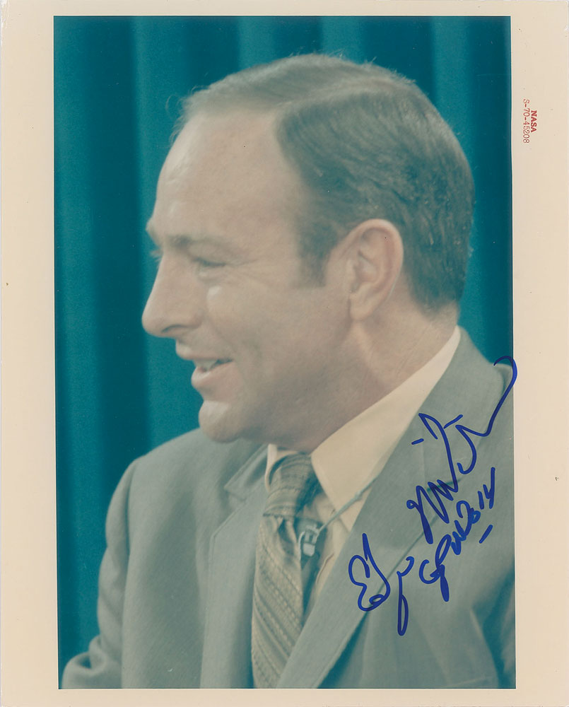 Official color glossy 8 x 10 red-numbered NASA photo of Mitchell in a suit and tie, signed in blue felt tip, "Edgar Mitchell, Apollo 14." Reverse bears purple NASA caption text and “A Kodak Paper” watermarks. In fine condition, with some light scratches in the right border.