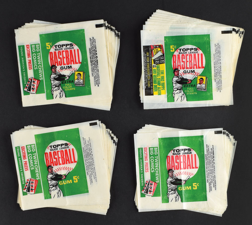 Total of 72 wrappers, 24 each with a side panel stamp album advertisement, a side panel chewing gum ad and a combined chewing gum ad, ”extra full color stamps” on front. Most of the wrappers are excellent overall condition, while some have small tears and creasing. With only few lower grade.