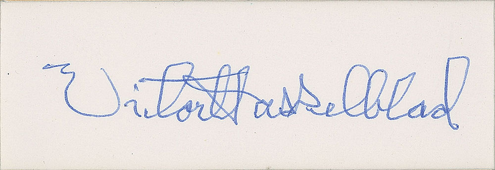 Swedish inventor and photographer (1906-1978) who is best known for inventing the Hasselblad 6x6 cm medium format camera; his surname has since become synonymous with space photography, as numerous astronauts from the Mercury, Gemini, and Apollo programs relied on Hasselblad cameras to document their missions. Rare ballpoint signature, "Victor Hasselblad,” on an off-white 3 x 1 card. Matted with a portrait to an overall size of 8.75 x 13. In fine condition, with a few small stains to the mat. The first Hasselblad autograph we have ever offered.