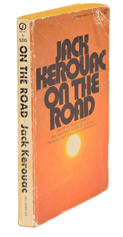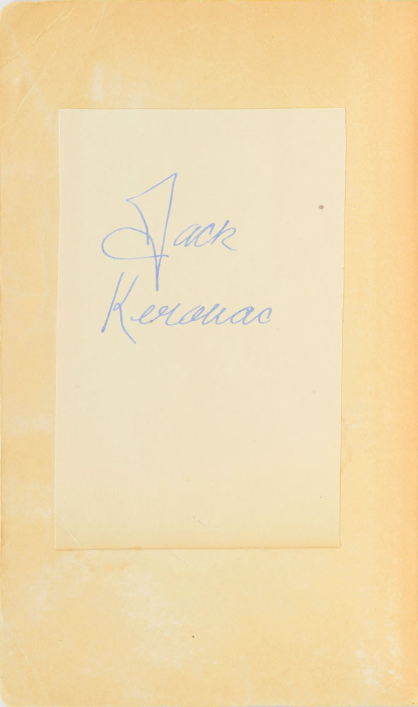 Fountain pen signature, "Jack Kerouac,” on an off-white 2.75 x 4.5 slip affixed inside the front cover of a Signet paperback edition of his legendary classic On the Road. Signature in fine condition; book in good condition, with heavy creasing to wrappers, ink annotations throughout, and toning to textblock.