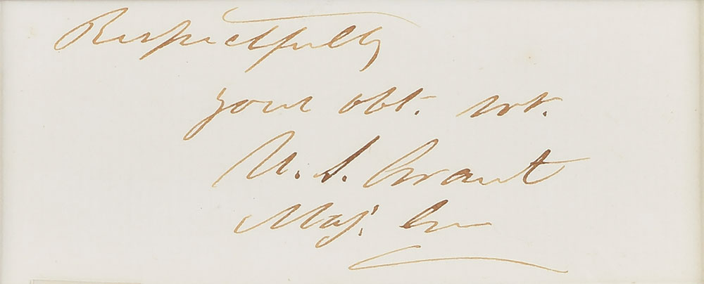 Crisply penned ink signature, "Respectfully, your obt. srt., U. S. Grant, Maj. Gen.,” on an off-white 3.5 x 1.5 sheet. Double-matted and framed with an engraving of Grant to an overall size of 12.5 x 16.75. In fine condition.