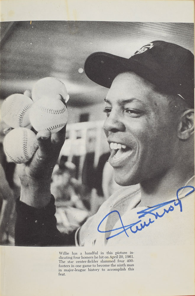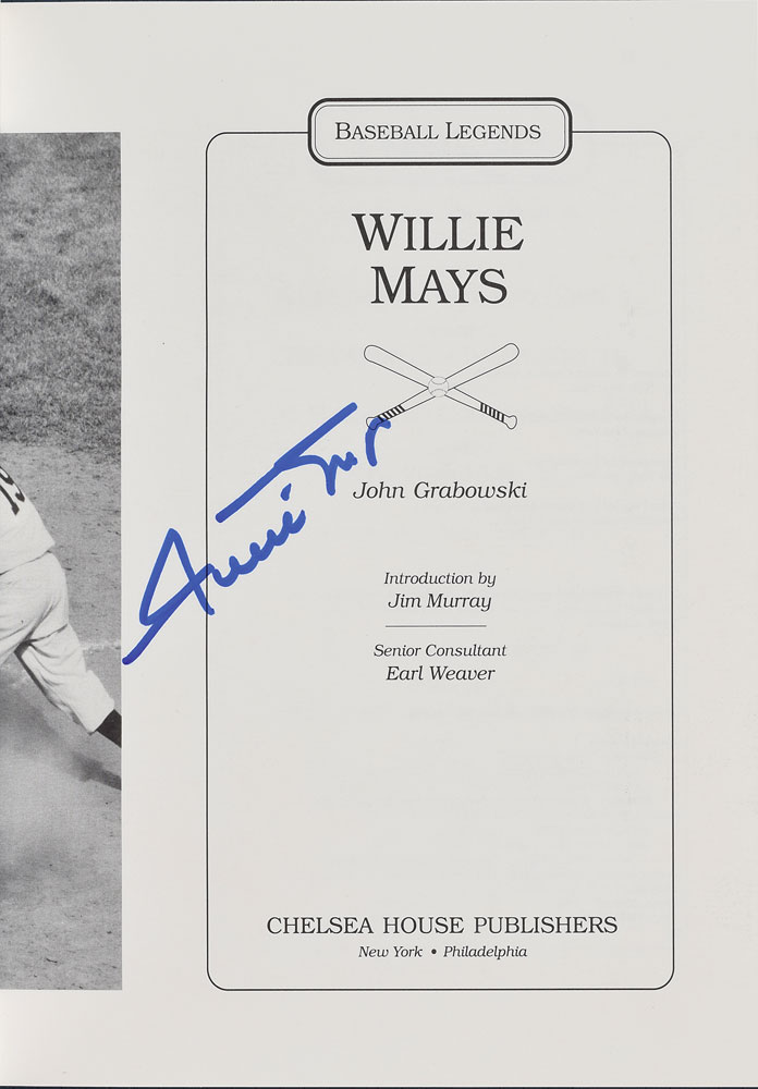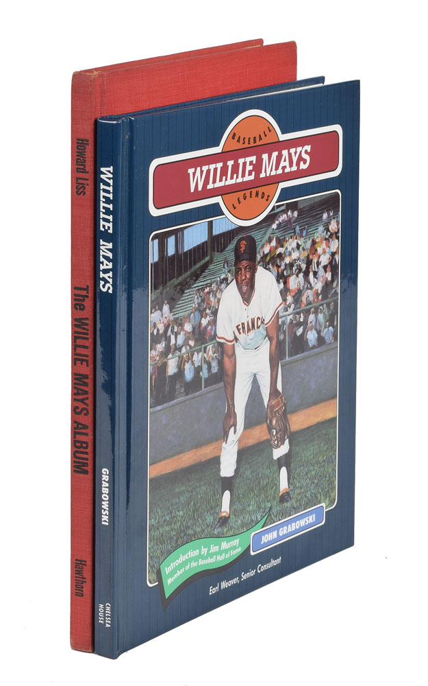 Two hardcover books: a first edition of The Willie Mays Album, signed on an inside page in blue felt tip; and a later printing of Baseball Legends: Willie Mays, signed on the title page in blue felt tip. In overall fine condition, with soiling to the front board of The Willie Mays Album, and toned paperclip impressions to the tops of the pages.