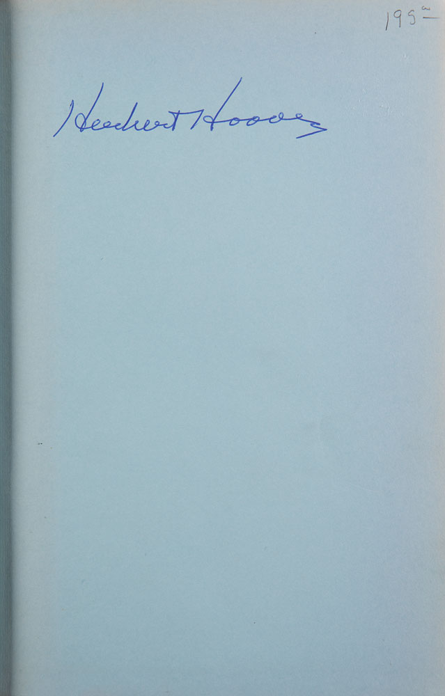 Two volumes of The Memoirs of Herbert Hoover: a first printing of Years of Adventure: 1874-1920, published by Macmillan in 1951, hardcover with dust jacket, signed on the first free end page in blue ballpoint, "Herbert Hoover"; and a second printing of The Cabinet & The Presidency: 1920-1933, published by Macmillan in 1952, signed and inscribed on the first free end page in ink, "To my good friend Ed Anthony, from Herbert Hoover." In fine condition, with chips and tears to the dust jackets.