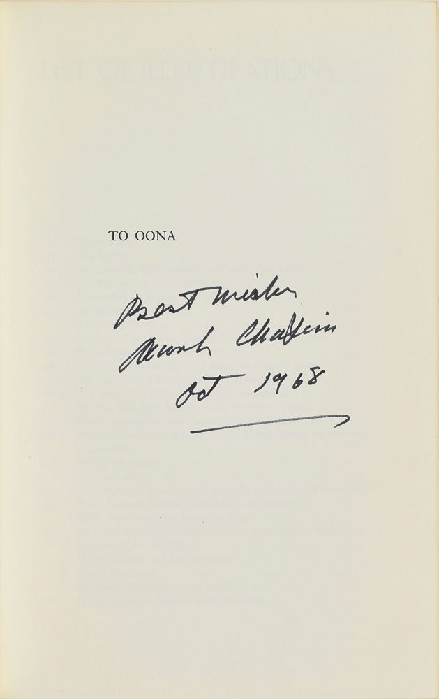 Signed book: My Autobiography: Charles Chaplin. First edition, first printing. NY: Simon & Schuster, 1964. Hardcover with dust jacket, 6.5 x 9.5, 512 pages. Signed on the dedication page in black felt tip, "Best wishes, Charlie Chaplin, Oct 1968." In fine condition, with a price-clipped dust jacket.