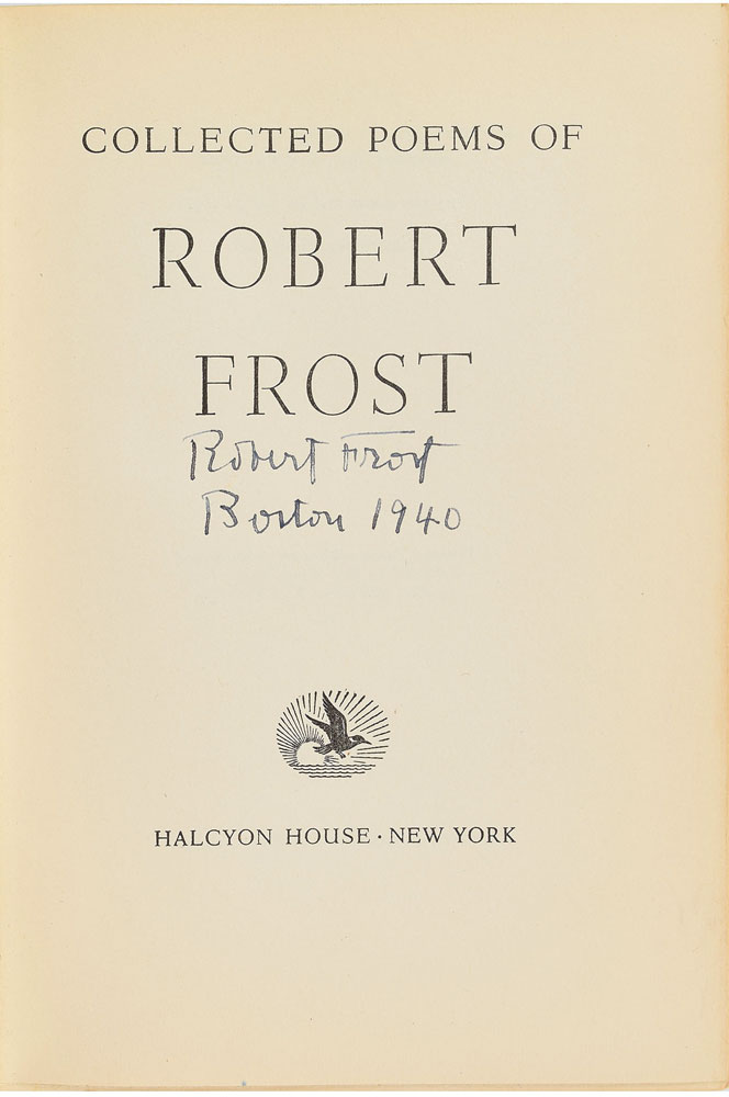 Signed book: Collected Poems of Robert Frost. Later printing. NY: Halcyon House, 1940. Hardcover with dust jacket, 6.25 x 8.75, 436 pages. Signed on the title page in ink, "Robert Frost, Boston 1940." In very good to fine condition, with paper loss and creasing to the dust jacket.