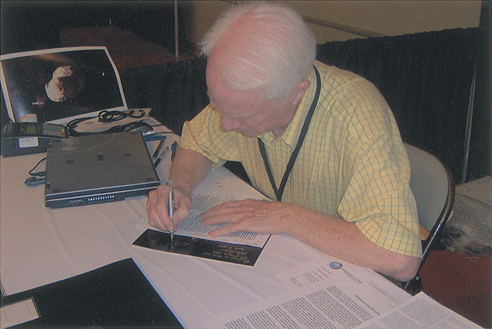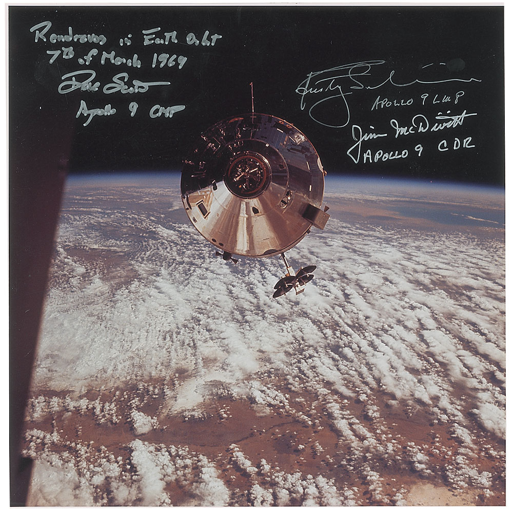 Exceptional color satin-finish 10 x 10 photo from of the Apollo 9 capsule in orbit, signed in silver ink, “Rendezvous in Earth Orbit, 7th of March 1969, Dave Scott, Apollo 9 CMP,” “Rusty Schweickart,” and “Jim McDivitt, Apollo 9 CDR.” In fine condition, with trimmed borders. Accompanied by a photo of Schweickart taken at time of signing.