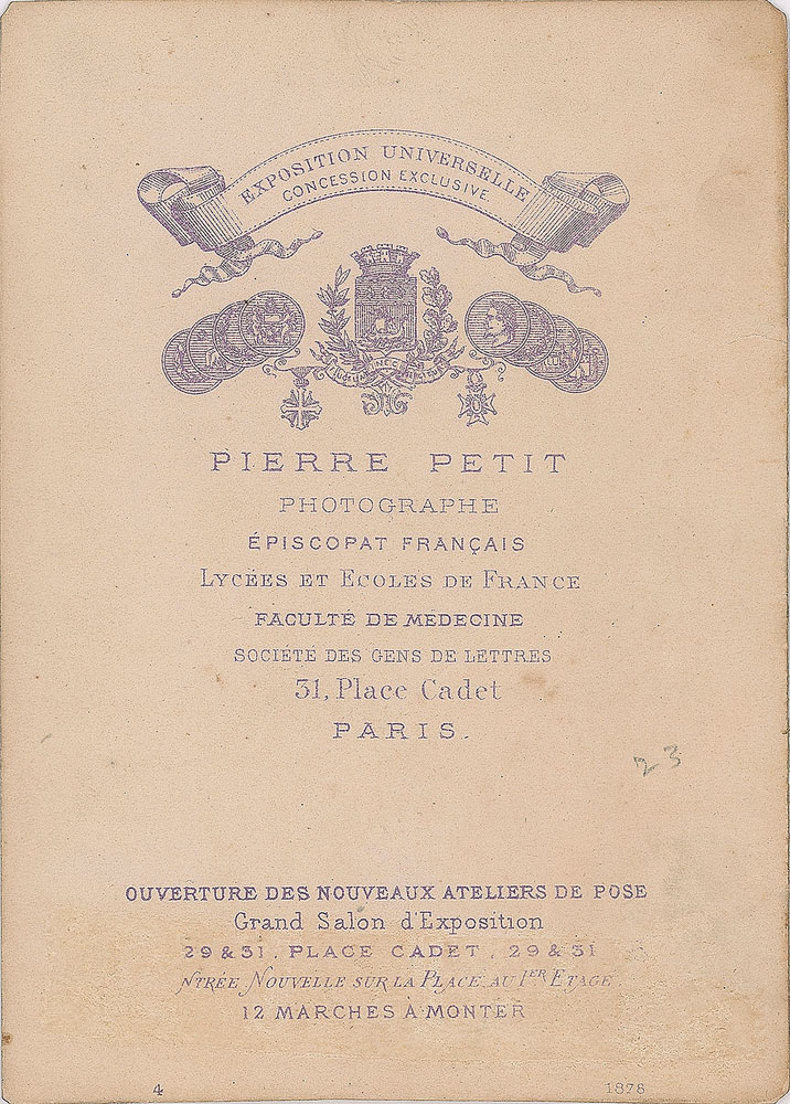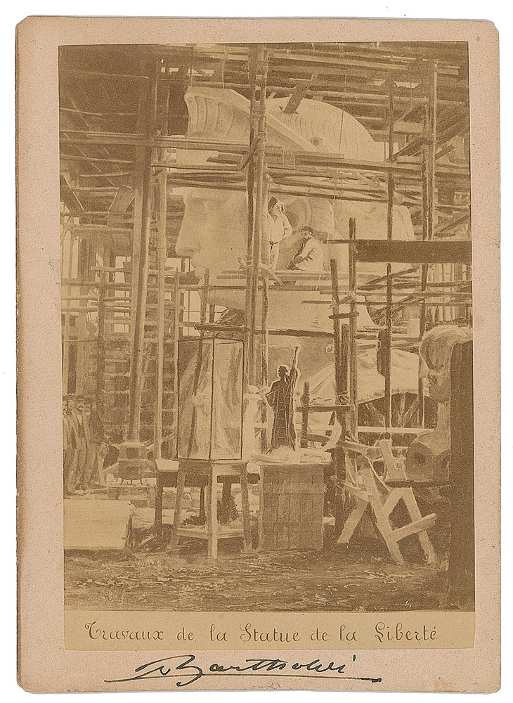 Eminent French sculptor (1834-1904) best known for designing the Statue of Liberty. Fantastic 3.25 x 4 mounted albumen image of the creation of the Statue of Liberty's head, signed on the mount in ink by Bartholdi. Published by Pierre Petit of Paris. In fine condition, with trimmed edges and light silvering to the image.