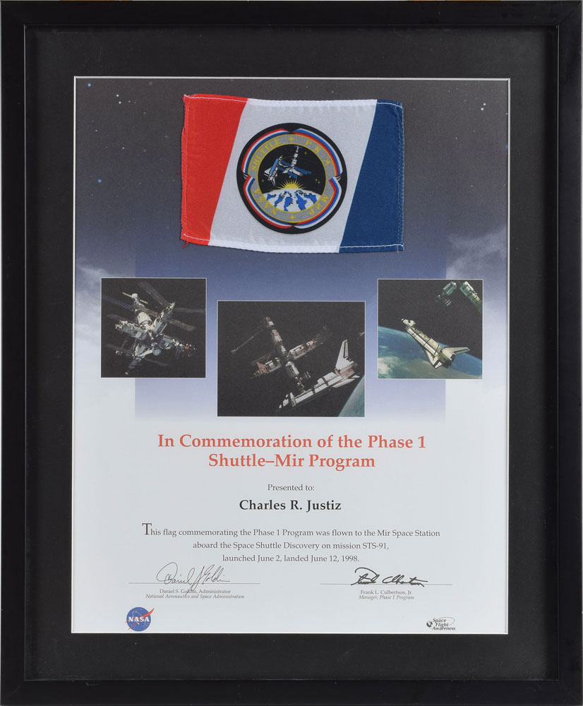 Flown flag bearing the Shuttle-Mir Program insignia, 5.5 x 3.75, carried aboard the Space Shuttle Discovery during the STS-91 mission from June 2-12, 1998. The flag is affixed to its original 10.75 x 13.75 printed certificate, which reads: "Presented to Charles R. Justiz. This flag commemorating the Phase 1 Program was flown to the Mir Space Station aboard the Space Shuttle Discovery on mission STS-91, launched June 2, landed June 12, 1998." Sheet bears two preprinted signatures. Matted and framed to an overall size of 14.25 x 17.25. In fine condition.