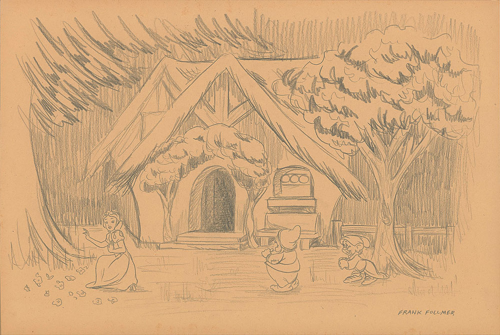 Fabulous original pencil concept sketch of Snow White's cottage from Snow White and the Seven Dwarfs on an off-white 18 x 12 sheet, signed in the lower right corner by Frank Follmer. The large, detailed drawing shows the woodland cottage with Snow White and two of the dwarfs outside. In fine condition.