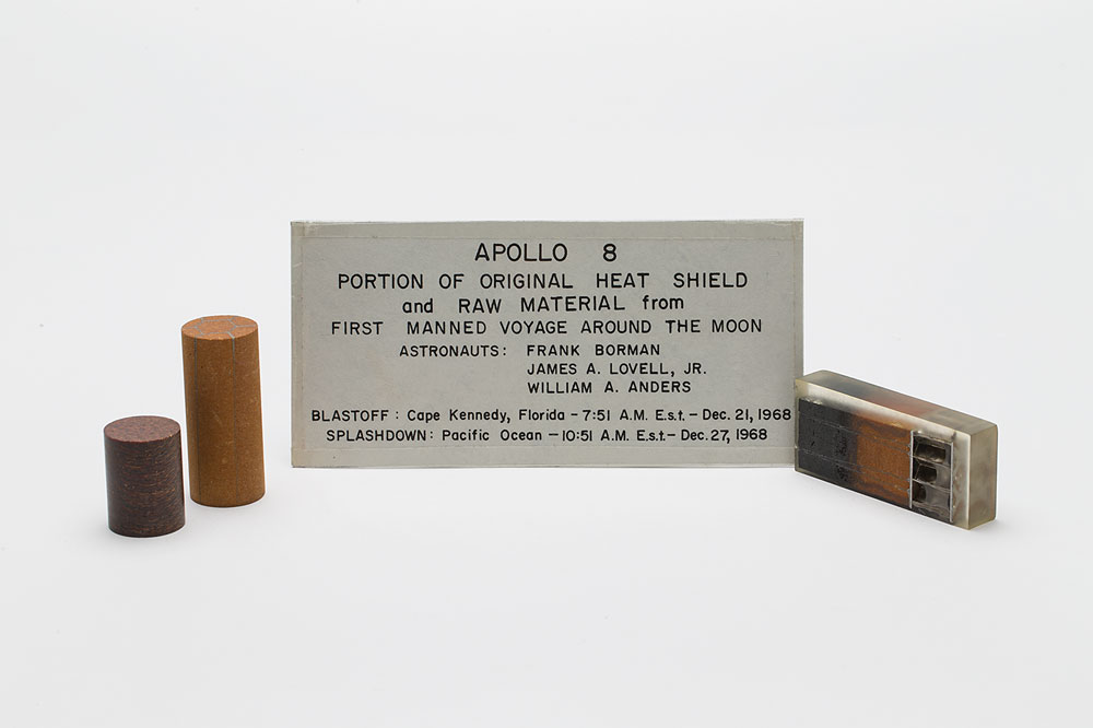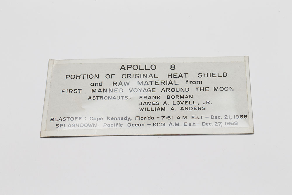 Segment of flown heat shield from the Apollo 8 capsule, encapsulated in Lucite, measuring 2.25 x 1 x .5, with a presentation card reading: "Apollo 8, Portion of Original Heat Shield and Raw Material from First Manned Voyage Around the Moon." Includes two additional unflown heat shield samples, one measuring 1.75″ tall and the other measuring 1″ tall. In fine condition. Accompanied by an Apollo 8 launch day cover.
