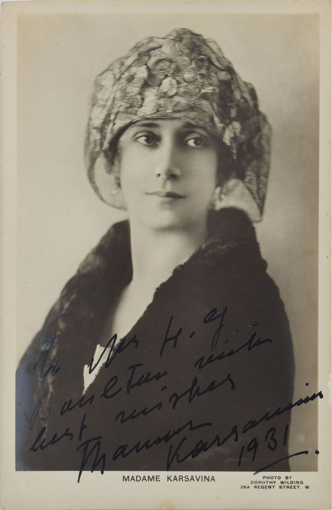 Russian ballerina (1885-1978) renowned for her beauty, most noted as a Principal Artist of the Imperial Russian Ballet and later the Ballets Russes of Serge Diaghilev. After settling in England, she began teaching ballet professionally and would become recognized as one of the founders of modern British ballet. Vintage matte-finish 3.5 x 5.5 postcard photo of Madame Karsavina, signed and inscribed in fountain pen, and dated 1931. In fine condition, with a bit of light silvering.