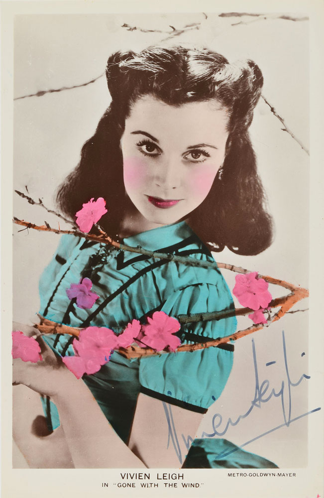 Wonderful vintage color glossy 3.5 x 5.5 photo of Vivien Leigh as Scarlett O'Hara in Gone With the Wind, boldly signed in fountain pen. In very fine condition. A marvelous photograph from this iconic film.