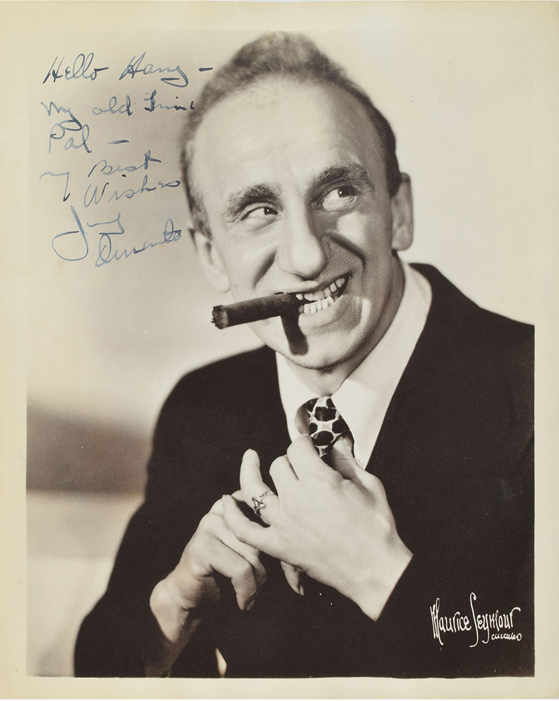 Classic vintage matte-finish 8 x 10 photo of Durante with a cigar by Maurice Seymour, signed and inscribed in fountain pen, "Hello Harry—my old…pal—best wishes, Jimmy Durante.” In fine condition.