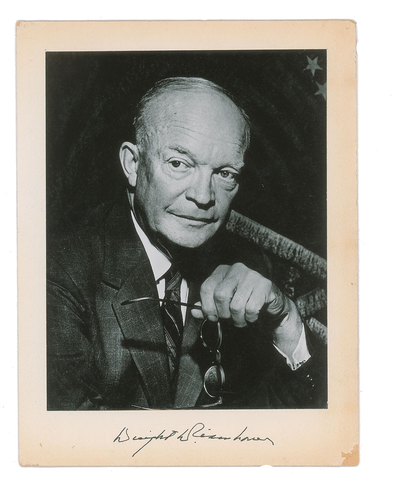Glossy 7.25 x 9.25 photo of Eisenhower holding his glasses, affixed to an 8.75 x 11.5 mount, neatly signed on the mount in black ink. Reverse bears a typed collector's label indicating that it was signed in Palm Desert, California, in 1964. In very good to fine condition, with the photo partially detached from mount, and some chipping to the mount.