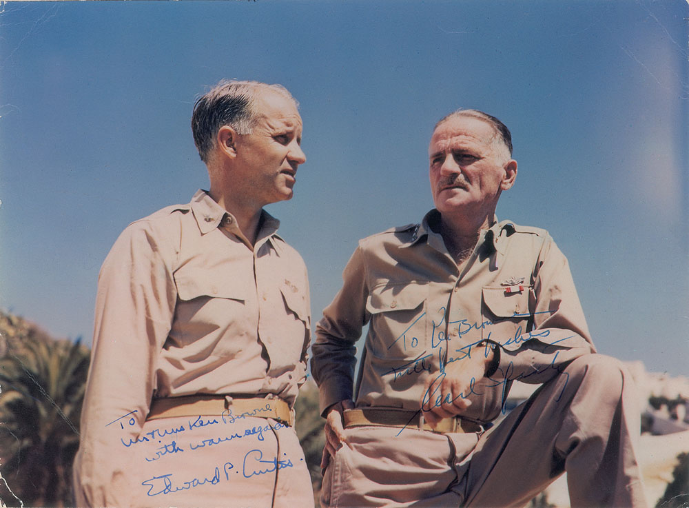 Color matte-finish 10.5 x 7.75 photo of the general and flying ace side-by-side, signed and inscribed in blue ink, "To Ken Browne, with best wishes, Carl Spaatz" and "To Mr. & Mrs. Ken Browne, with warm regards, Edward P. Curtis.” In very good condition, with creasing to the edges and corners.