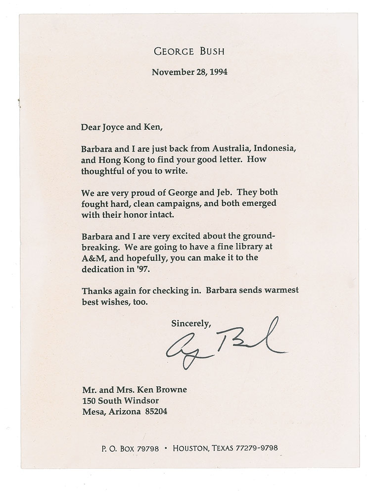 TLS, one page, 6.25 x 8.5, personal letterhead, November 28, 1994. Letter to Mr. and Mrs. Ken Browne, in part: "Barbara and I are just back from Australia, Indonesia, and Hong Kong to find your good letter. How thoughtful of you to write. We are very proud of George and Jeb. They both fought hard, clean campaigns, and both emerged with their honor intact. Barbara and I are very excited about the groundbreaking. We are going to have a fine library at A&M, and hopefully, you can make it to the dedication in '97." In fine condition. Accompanied by the original mailing envelope.